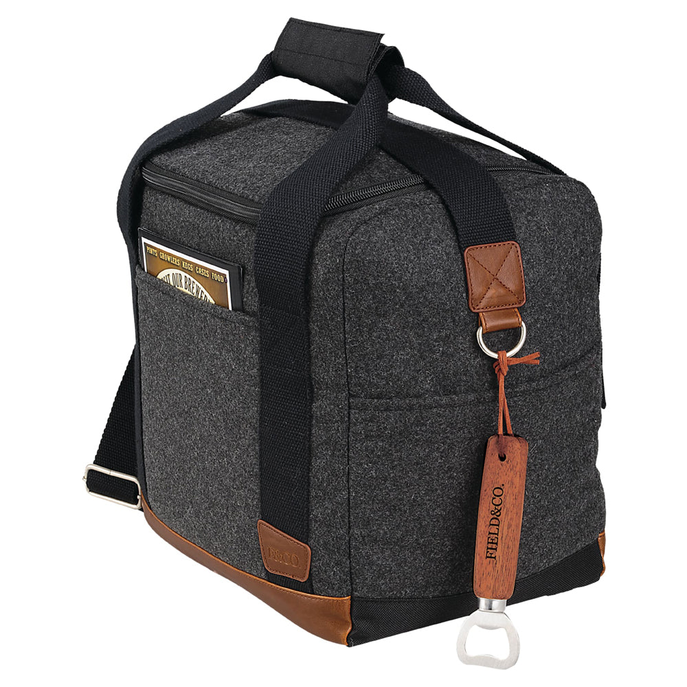Part of the Field & Co.® Campster Series, inspiration was drawn from retro camping and old school scout looks combined with modern needs. This cooler combines the stylization of a wool/poly material and vinyl accents with the function of an insulated cooler with bottle divider. Die cut inserts slip together and create individual compartments for twelve individual 12oz bottles. When not in use they can be collapsed and placed in the bottom of the piece. Includes a Field & CO. branded natural wood bottle opener.